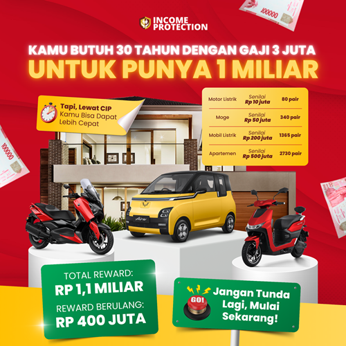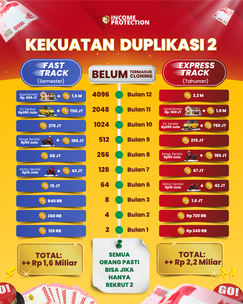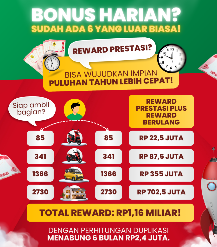 Hanya dengan 1.365 kiri dan 1.365 kanan duplikasi nabung tahunan (bisa cicil nabung bulanan bahkan harian), kita bisa jadi milyarder, dikasih kendaraan dan rumah + banyak tabungan di CIP