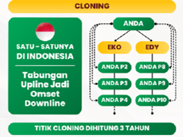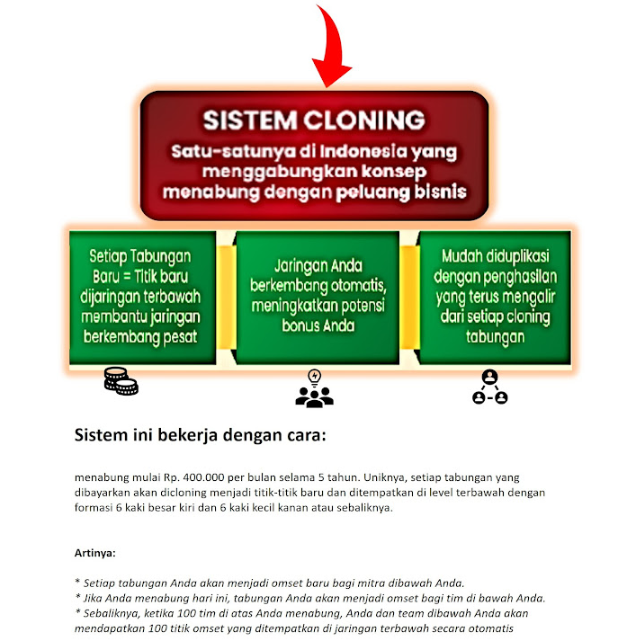 menabung Rp 400.000 per bulan selama 5 tahun. Uniknya, setiap tabungan yang dibayarkan akan di cloning menjadi titik-titik baru dan ditempatkan di level terbawah sehingga semua akan mendapatkan guyuran omset dan bonus.