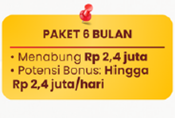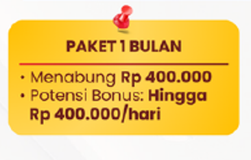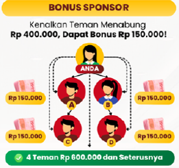Setiap merekut 1 Nasabah Baru : 1. Paket Rp. 400.000, Bonusnya Rp. 150.000 2. Paket 800.000 Bonusnya = Rp. 300.000 Coba jika sehari lebih dari 1 Nasabah? Bonus SPONSOR = 37,5%, BANDINGKAN dengan di perusahaan lain!? Jika sehari ajak 10 Nasabah saja = Rp. 1.500.000 maka sebulan = Rp. 45.000.000 Untuk paket Rp. 800.000 = Rp. 90.000.000