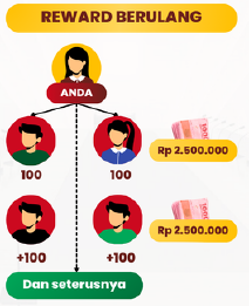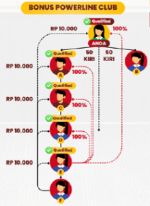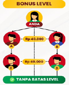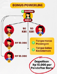 Setiap terjadi 50 titik kiri - 50 titik kanan, maka berhak mendapat Rp. 10.000 setiap ada nasabah baru, pada jalur keturunan Anda tanpa melihat kaki besar atau kecil tanpa batas kedalaman.