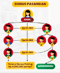Setiap terjadi posisi dibawah kita terisi , di titik kanan dan kiri , artinya terbentuk satu pasang,Anda akan mendapatkan Bonus Pasangan = Rp. 20.000. Titik yang terbentuk berasal dari setiap Nasabah Baru atau setiap Nasabah melakukan pembayaran. Potensi Bonus Pasangan = Rp. 4.000.000 perhari