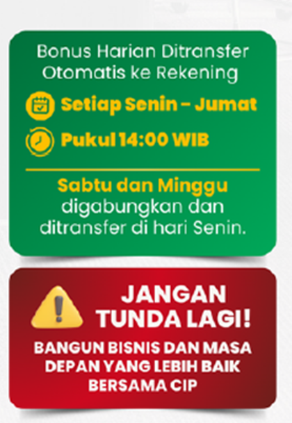 Dengan kekuatan clonning & omset terakumulasi tanpa batas waktu reward-reward CIP semakin dekat setiap harinya