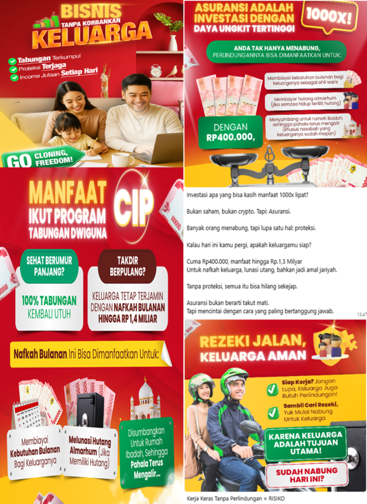 Sistem ini bekerja dengan cara : Menabung Rp 400.000 per bulan selama 5 tahun. Uniknya, setiap tabungan yang dibayarkan akan di cloning menjadi titik-titik baru dan ditempatkan di level terbawah sehingga semua akan mendapatkan guyuran omset dan bonus. Klik Info detail dan cara daftarnya