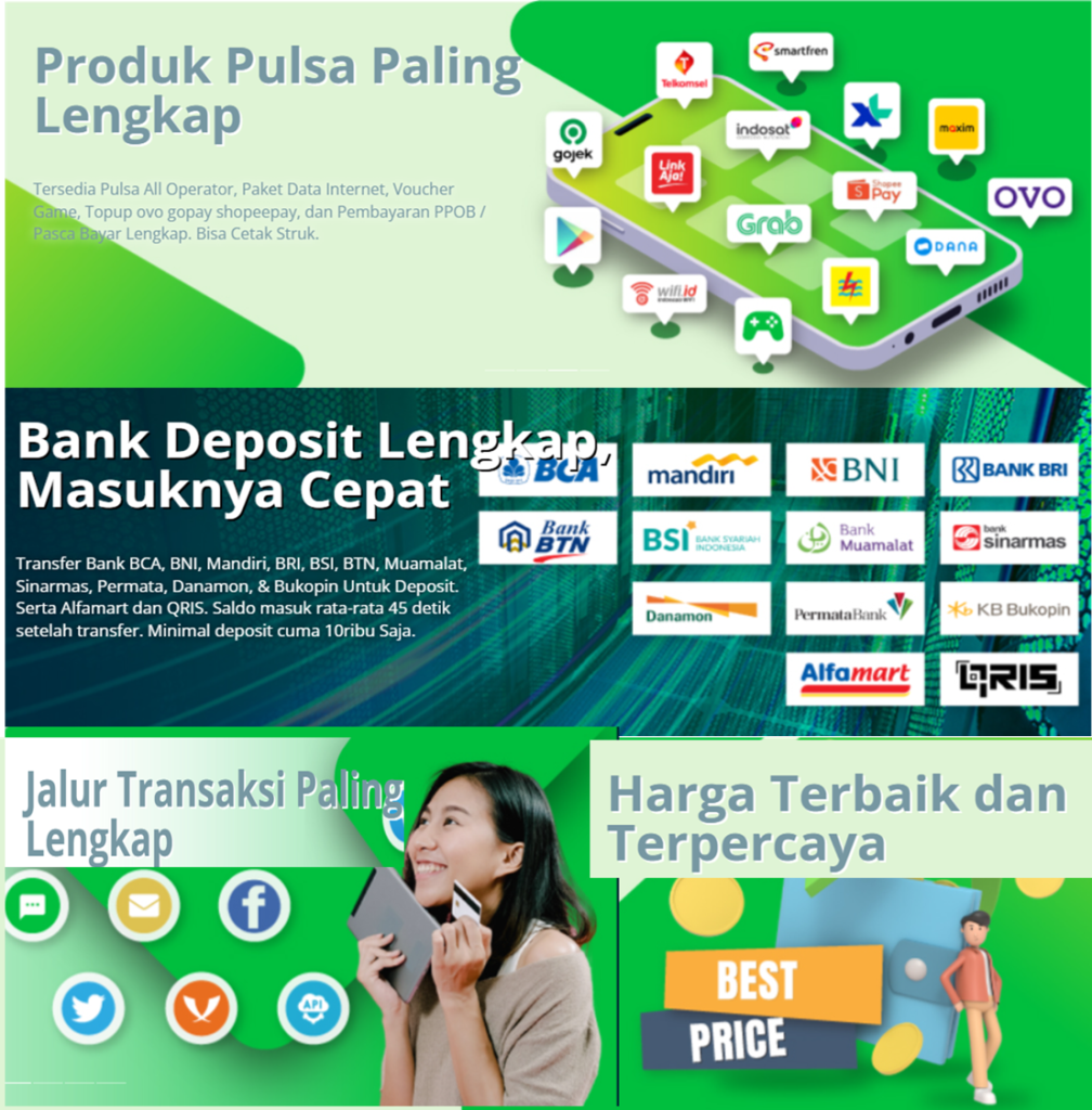 Mau jadi agen pulsa murah all operator dengan sistem server pulsa termurah? Bahkan Anda tak perlu investasi server atau menyewa server kepada kami alias invetasi Rp. 0,- untuk dapat memulainya. Kami menyediakan berbagai macam variasi produk Pulsa Elektrik All Operator, Paket Kuota Data Internet, Token Listrik Prabayar, Voucher Game Online, dan Pembayaran tagihan PPOB Pasca Bayar. . Klik Info detailnya